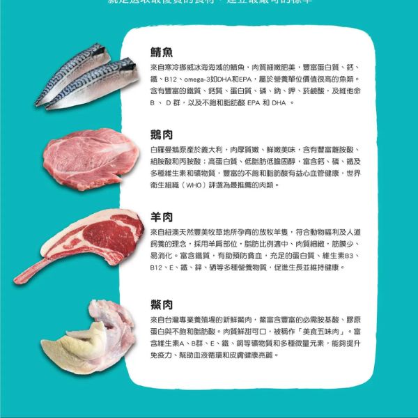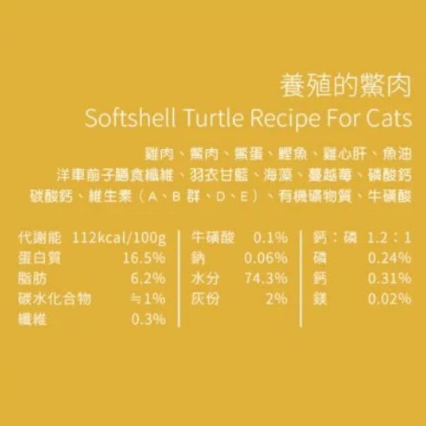 成份: 雞肉、鱉肉、鱉蛋、鰹魚、雞心肝、魚油、洋車前子膳食纖維、羽衣甘藍、海藻、蔓越莓、磷酸鈣、碳酸鈣、維生素(A、B群、D、E)、有機礦物質、牛磺酸