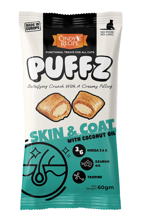 Cindy’s Recipe@Puffz功能性貓零食具有雙重質地的酥脆外皮和令人驚嘆的柔軟奶油狀中心 ; 僅採用最優質的成分製成,含有椰子油、纖維、維生素 D3 和低聚果糖-每種成分均專為解決貓的常見問題(如毛球、牙齦疾病、皮膚或腸道敏感),而設計非常適合玩耍和作為貓的獎勵。