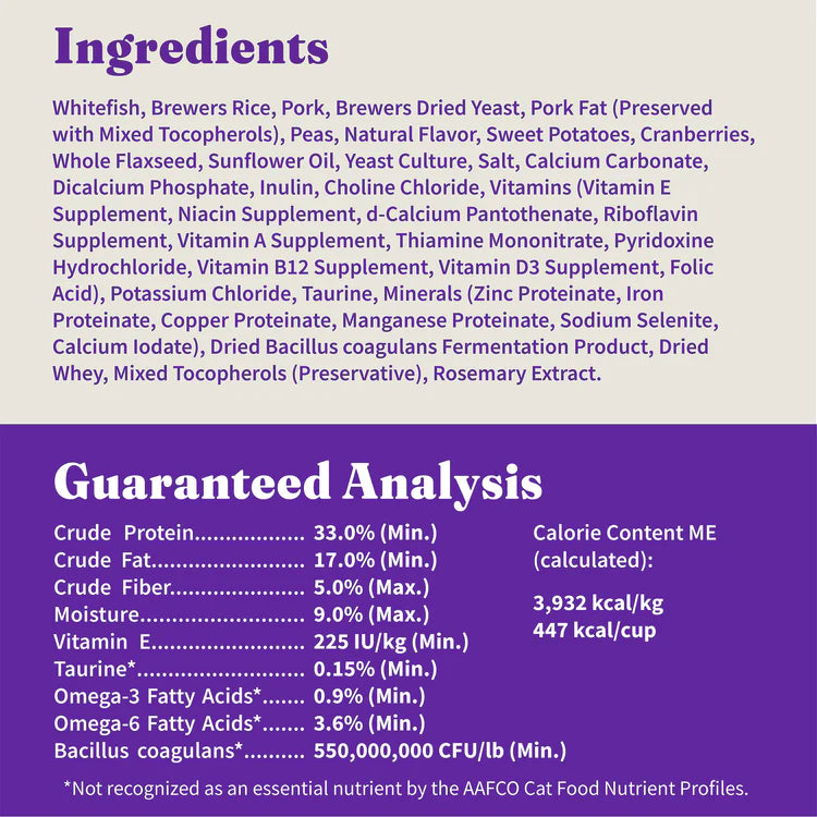 白魚、米、豬肉、啤酒乾酵母、豬肉脂肪(用混合生育酚保存)、豌豆、天然香料、紅薯、蔓越莓、全亞麻籽、葵花籽油、酵母培養物、鹽、碳酸鈣、磷酸氫鈣、菊粉、膽鹼氯化物、維生素(維生素E 補充劑、菸鹼酸補充劑、d-泛酸鈣、核黃素補充劑、維生素A 補充劑、單硝酸硫胺、鹽酸吡哆醇、維生素B12 補充劑、維生素D3 補充劑、葉酸)、氯化鉀、牛磺酸、礦物質(蛋白鋅) 、蛋白鐵、蛋白銅、蛋白錳、亞硒酸鈉、碘酸鈣)、乾凝結芽孢桿菌發酵產品、乾乳清、混合生育酚(防腐劑)、迷迭香萃取物。