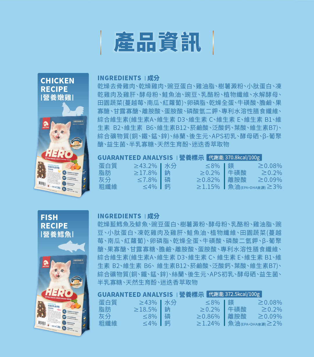 代謝能372.5kcal/100g、蛋白質≥43%、脂肪≥18.5%、灰分≤8%、粗纖維≤4%、水分≤8%、鈉≥0.2%、磷≥0.86%、鈣≥1.24%、鎂≥0.08%、牛磺酸≥0.2%、離胺酸≥0.09%、魚油(EPA+DHA來源)≥2%