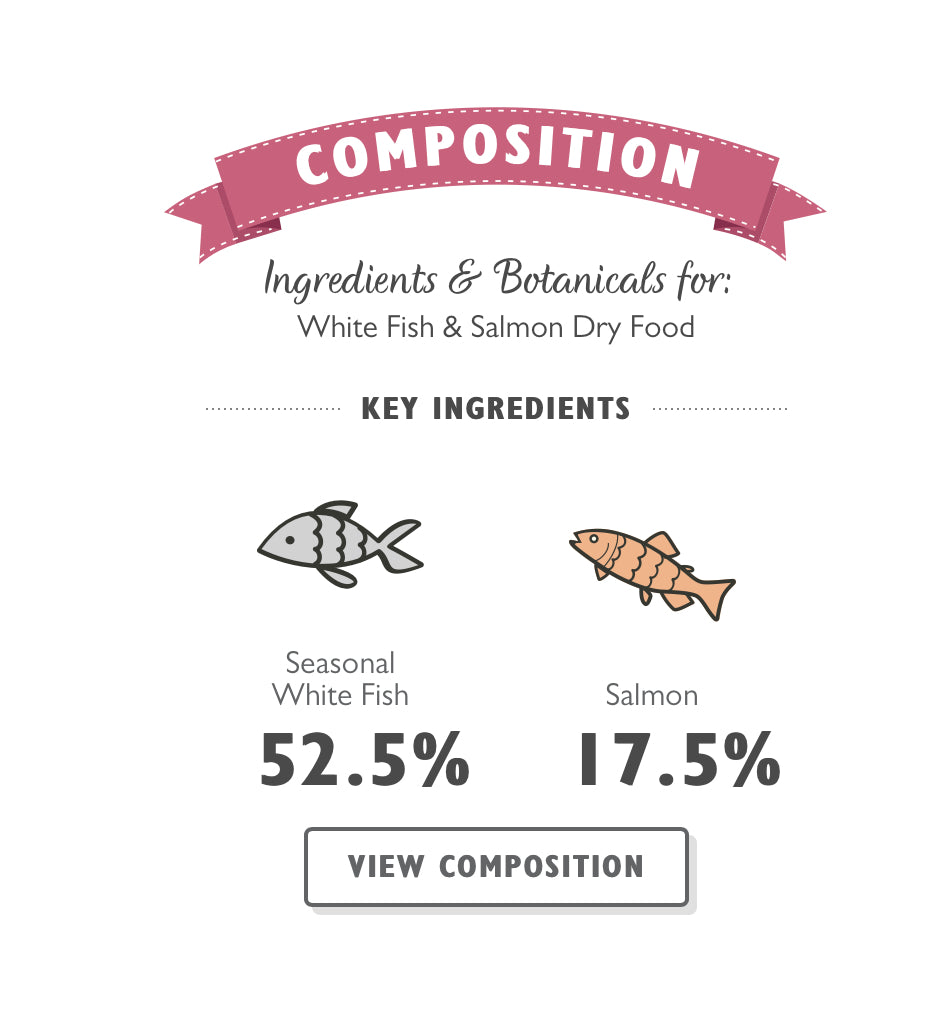 52.5%白魚 17.5%三文魚, 馬鈴薯,馬鈴薯蛋白,雞蛋,雞肉汁,纖維素,魚湯,亞麻籽,益生元低聚果糖0.7g / kg,意大利奶酪,海藻,胡蘿蔔,小紅莓,越桔,歐芹,胡蘆巴種子