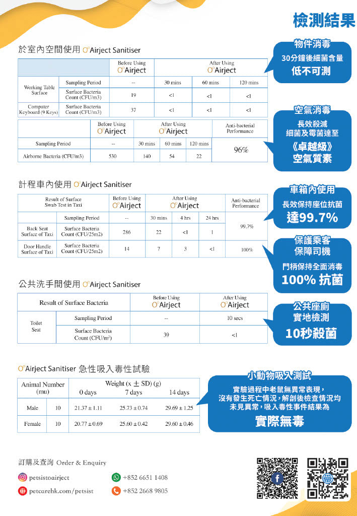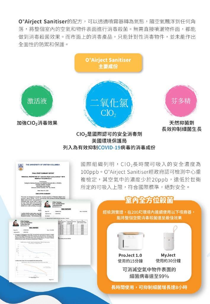 經檢測實證,在200尺空間內使用O゚ProJect 1.0,啟用15分鐘,有效殺滅細菌和病毒達99% 。