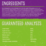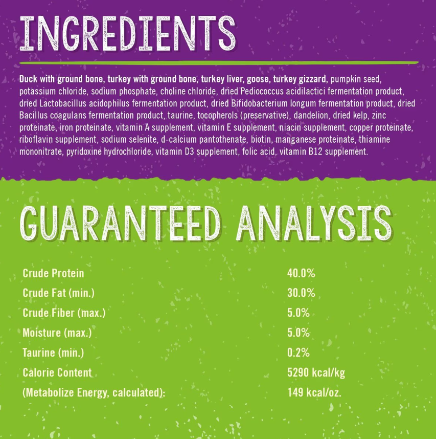 鴨骨與土骨,土耳其,土耳其肝,鵝,土耳其G,南瓜籽,氯化鉀,磷酸二氫鈉,氯化膽鹼,牛磺酸,乾燥的Pediococcus acidilactici發酵產品,乾燥的嗜酸乳桿菌發酵產品,幹雙歧桿菌發酵產品,生育酚(防腐劑),碳酸鈣,蛋白酸鋅,硫酸鋅,硫酸鐵,蛋白質鐵,維生素E補充劑,菸酸,硫酸銅,蛋白質銅,核黃素,硫酸錳,亞硒酸鈉,錳蛋白酸鹽,硫胺素單硝酸鹽,鹽酸吡哆醇,維生素D3補充劑,葉酸,碘酸鈣,維生素B12補充劑